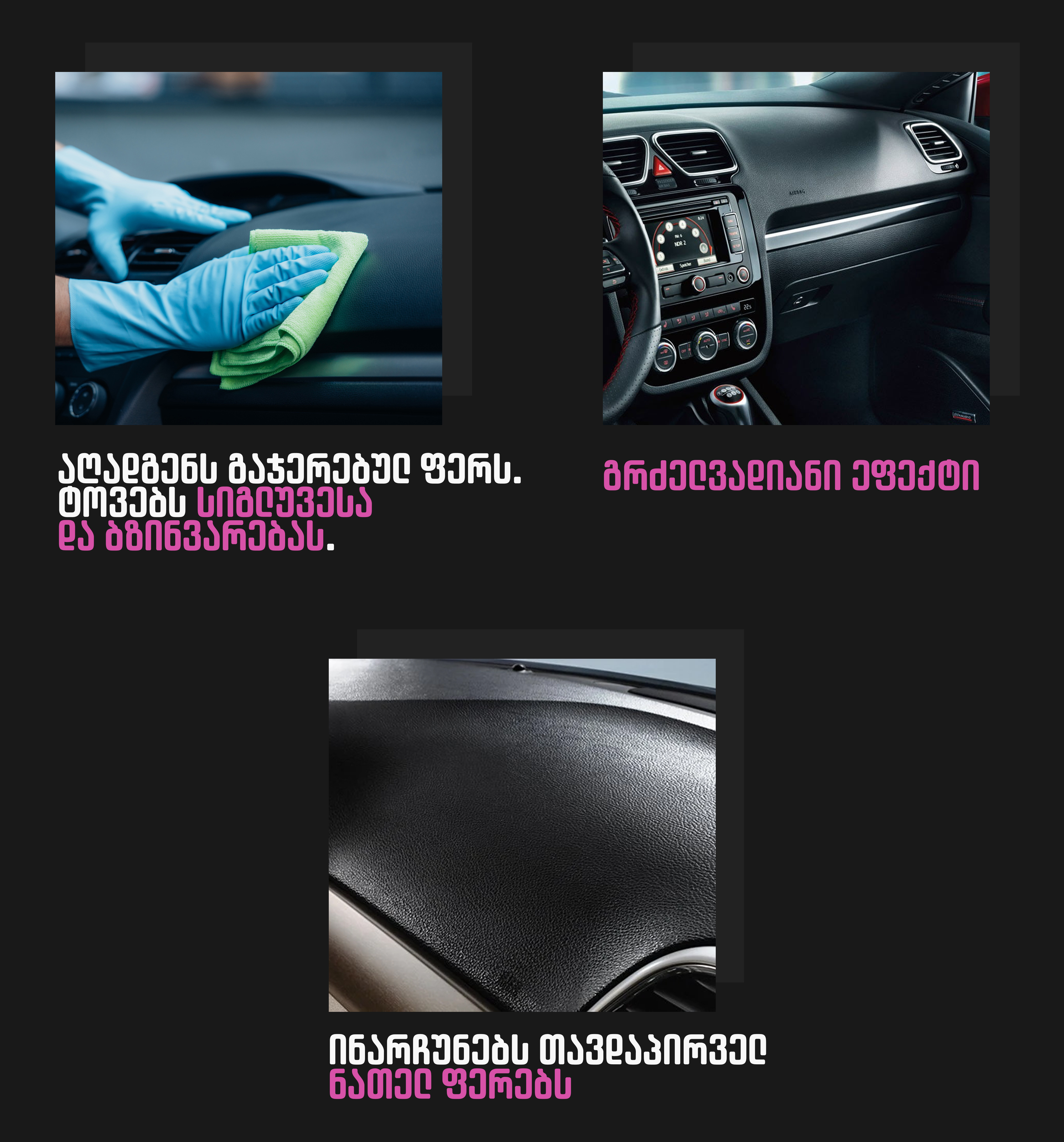 დამცავი საფარი, რომელიც ანიჭებს სიკაშკაშეს პლასტმასის ნაწილებს: ბამპერებს, ფარებს, სარკეებს, ძრავის საფარს, მანქანის ინტერიერსა და ა.შ. აღადგენს და აჯერებს მოსაწყენ, გაცვეთილ და ძველ პლასტმასის ფერს. უძლებს 300 °C-მდე ტემპერატურას. გამოდგება ყველა პლასტმასის ნაწილზე.