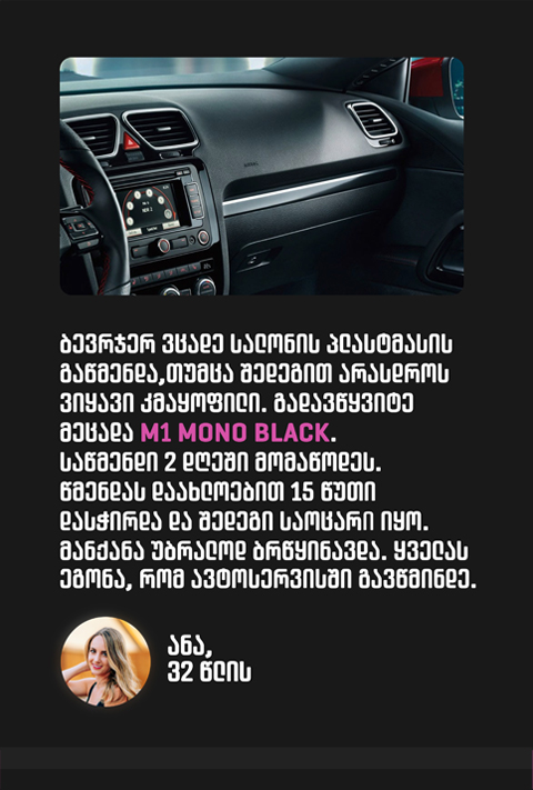 დამცავი საფარი, რომელიც ანიჭებს სიკაშკაშეს პლასტმასის ნაწილებს: ბამპერებს, ფარებს, სარკეებს, ძრავის საფარს, მანქანის ინტერიერსა და ა.შ. აღადგენს და აჯერებს მოსაწყენ, გაცვეთილ და ძველ პლასტმასის ფერს. უძლებს 300 °C-მდე ტემპერატურას. გამოდგება ყველა პლასტმასის ნაწილზე.